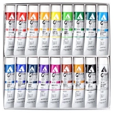 Set of 18 includes: Carmine, Scarlet, Orange, Deep Yellow, Lemon Yellow, Light Green, Green, Viridian. Cerulean Blue, Cobalt Blue, Ultramarine Deep, Navy Blue, Violet, Magenta, Burnt Sienna, Yellow Ochre, Jet Black, Titanium White.