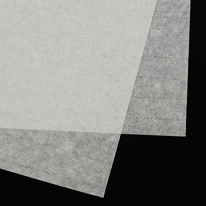 A versatile machine-made paper, Usu Kuchi has been dried on an iron surface and so may have small iron spots appear over time. Very absorbent and great for dyeing, suminagashi, printmaking or chine colle.